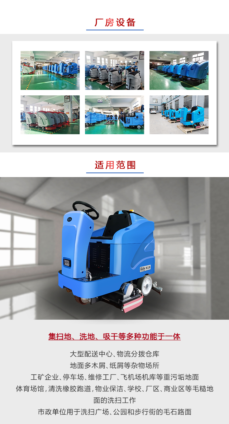 该机集扫地、洗地、吸干等多种功能于一体,特别适合于地面上有少量垃圾或者凸凹不平的防滑地面(如防滑瓷砖、塑胶跑道等),也特别适合于油污粉尘比较顽固的地面。